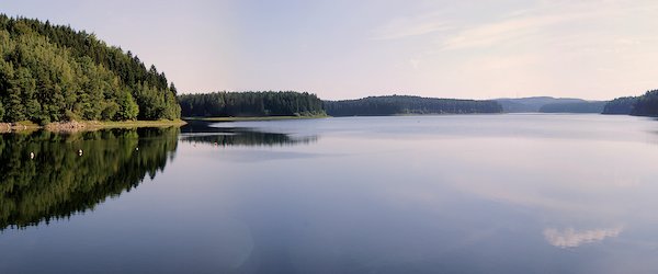Der große Stausee unweit von Wolkenstein lädt zum Wandern, Radfahren und Picknicken ein. Im Sommer glitzert das Wasser türkisblau zwischen den bewaldeten Hängen.